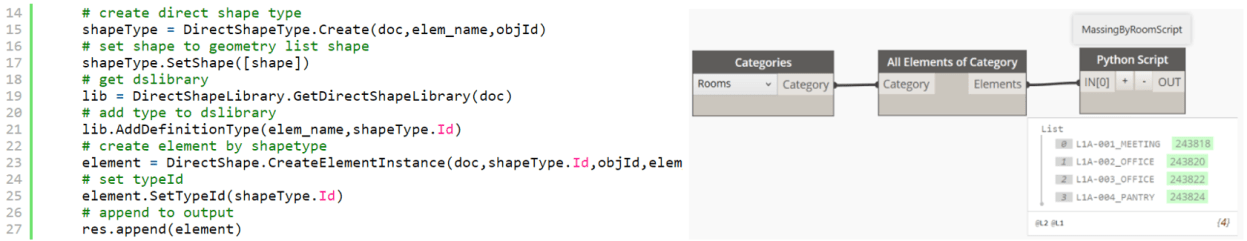 Loop each room, first collect name and number with LookupParameter method and create naming for massing element by concatenating collected name and number. Get room geometry, which returns a list but we only need the first index, from this geometry list. And we create a DirectShapeType by using static method of DirectShapeType class which required three arguments; doc, element name and objectId (which is the mass category id). We need to store each newly created DirectShapeType in the DirectShapeLibrary. Finally, we create the DirectShape element instance which is the massing element that we want and append this massing element to the output list.