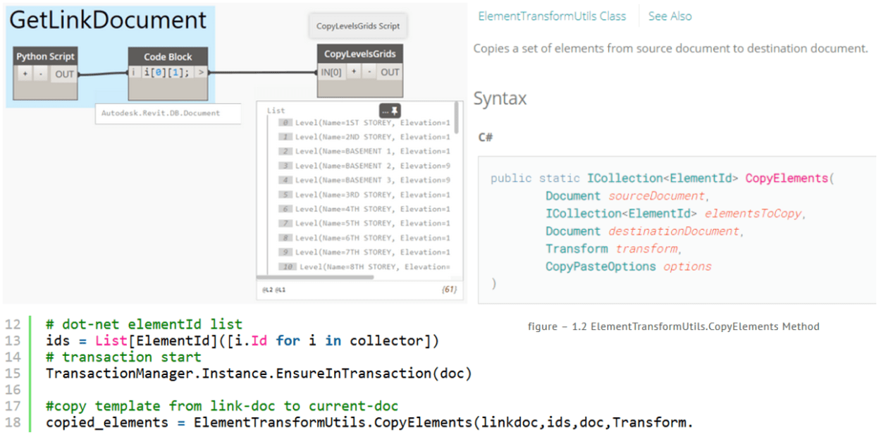 # input link document linkdoc = UnwrapElement(IN[0]) # collect grids from the link document collector = FilteredElementCollector(linkdoc).OfClass(Grid).ToElements() # collect levels from the link document levels = FilteredElementCollector(linkdoc).OfClass(Level).ToElements() # convert python list collector = list(collector) # grid list combine with level list collector.extend(levels) # dot-net elementId list ids = List[ElementId]([i.Id for i in collector]) # transaction start TransactionManager.Instance.EnsureInTransaction(doc) #copy template from link-doc to current-doc copied_elements = ElementTransformUtils.CopyElements(linkdoc,ids,doc,Transform.Identity,CopyPasteOptions()) # transaction done TransactionManager.Instance.TransactionTaskDone() # get elements from ids elements = [doc.GetElement(i) for i in copied_elements] # output OUT = elements