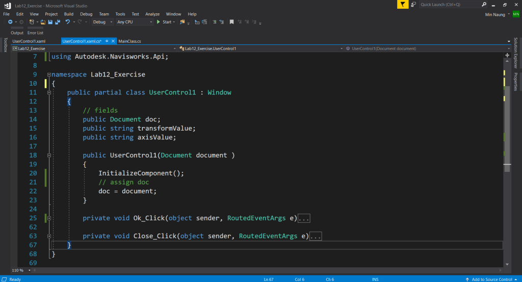 In our UserControl partial class, create three fields: doc for the current Document, transform for user input transform value and axisValue for user selected radio button axis value. And we have two click-event callback methods for Close and OK buttons. (figure 1.3)