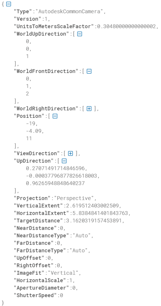 Viewpoint includes a method to collect its properties in terms of an JSON AutodeskCommonCamera object (it is actually a json file), we can get/write and export this return json data of viewpoint to a text file and save it on desktop or anywhere you like.