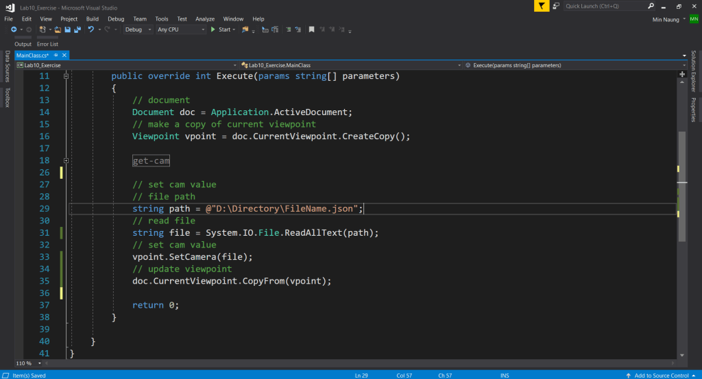 You can modify and play with these numbers from the exported json file. After modified these values, we will uses this JSON AutodeskCommonCamera object to set Viewpoint value. First have to read these json data as a string and provide the string value to SetCamera method as a parameter (figure 1.2).