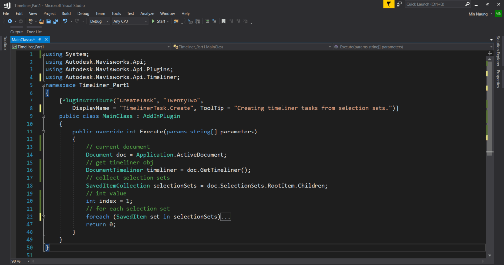 Setting up Navisworks® Add-Ins project in the visual studio, you can follow Creating Navisworks Add-Ins tutorial to set up the project. When you are ready, in the Execute method, we are going collect the Timeliner object and (saved)SelectionSets from the current document. GetTimeliner method can use to collect the Timeliner object and from SeletionSets property we are able to collect SavedItemCollection, represents a collection of SavedItems and appears in the various classes relation to SelectionSets. (figure 1.0)