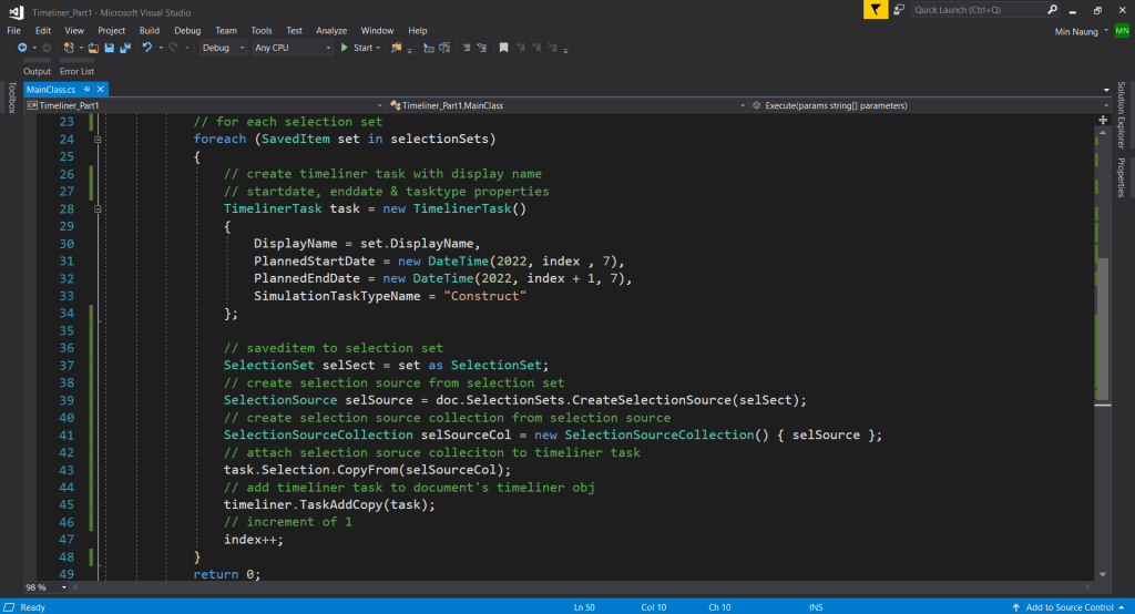 The next step is to loop each of the collected SelectionSets to create the TimelinerTasks. Create each TimelinerTask via the TimelinerTask constructor with primary properties : DisplayName – set DisplayName value from SelectionSet DisplayName, Start/End Date – set DateTime object with year, month and date. (For the sake of simplicity, incrementation of 1(index) assign to month). And for SimulationTaskTypeName is “Construct” (you can assign default types such as “Demolish”, “Temporary”). (figure 1.1)